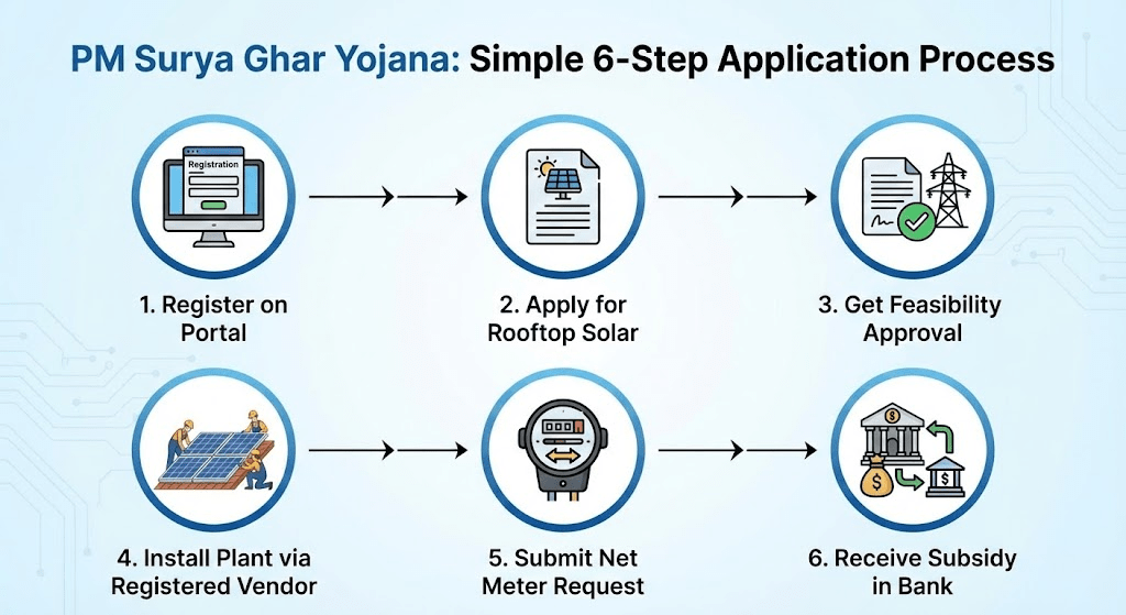 1. Register on the Portal: Visit the official website pmsuryaghar.gov.in and register by selecting your State, Electricity Distribution Company (DISCOM), and entering your Electricity Consumer Number, Mobile Number, and Email.
